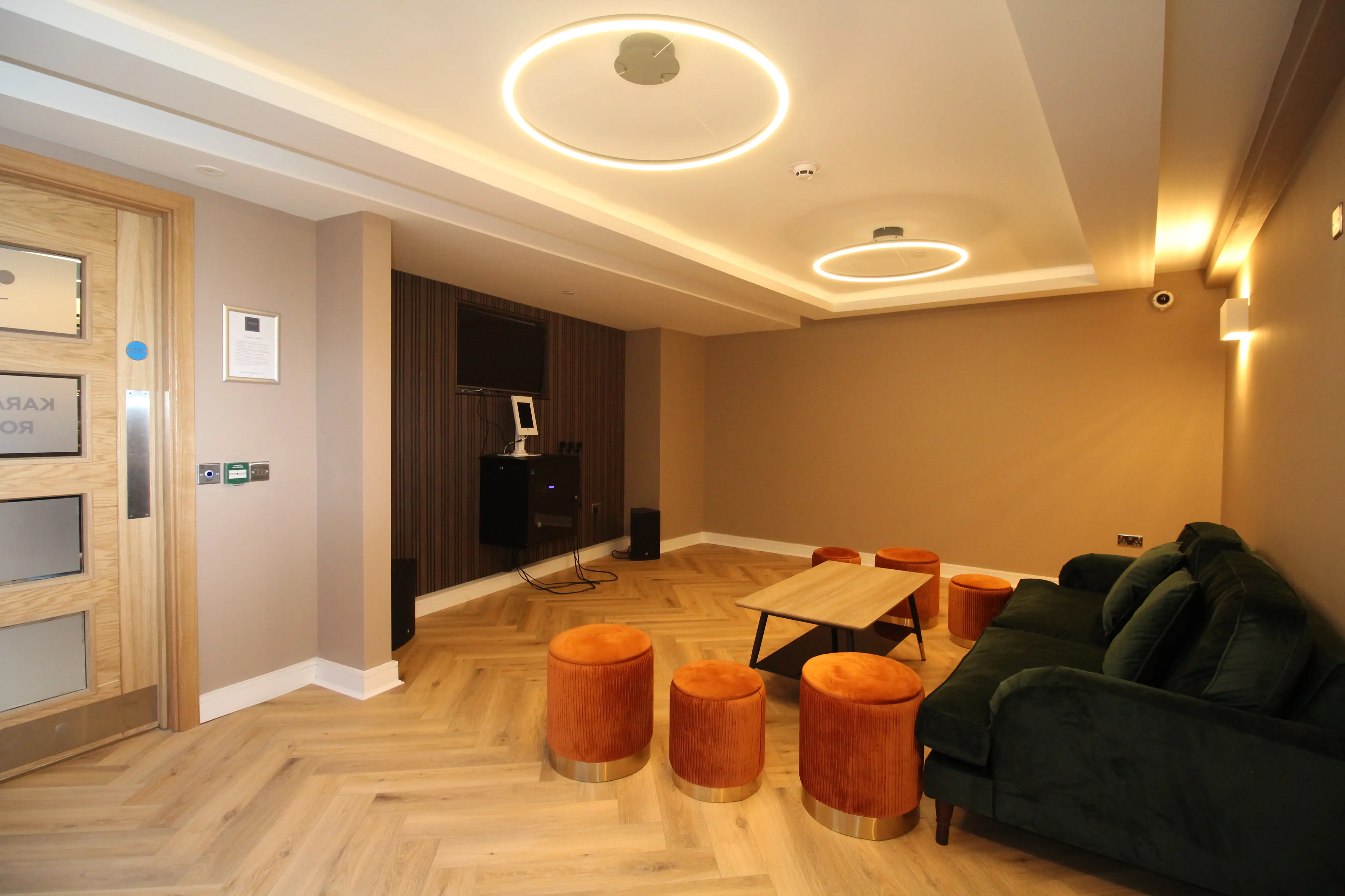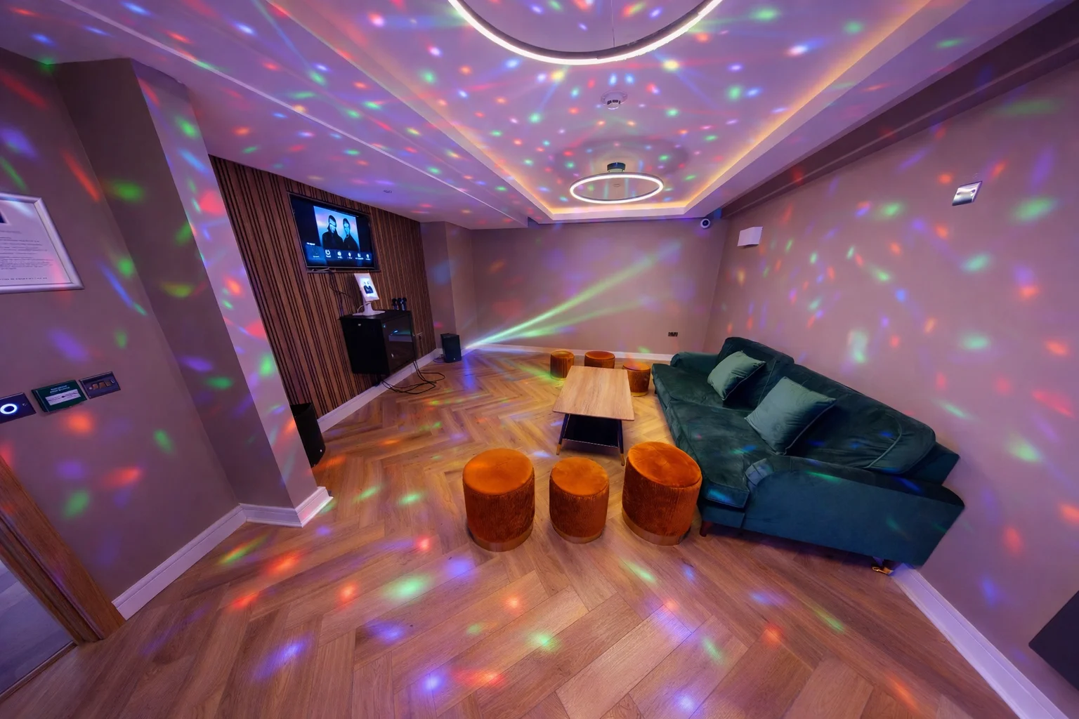 无论您是经验丰富的卡拉 OK 专家,还是第一次唱卡拉 OK,您都会爱上我们时尚现代的房间,这里有顶级的音响系统、炫目的灯光效果,还有为您和朋友准备的舒适座位。在这里,您可以尽情释放自己,一展歌喉,在史诗般的卡拉 OK 派对中留下难忘的回忆。